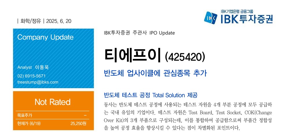 "티에프이는 단기 실적 부진을 딛고, 반도체 업황 반등과 함께 다시 날아오를 준비를 마친 상태입니다."